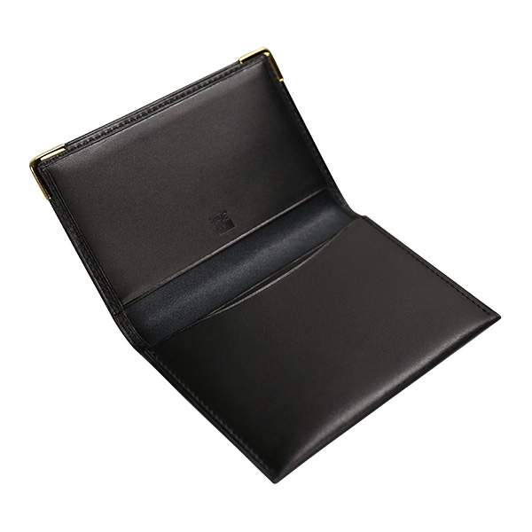 スタンダードでシンプルな形の名刺入れに、伊東屋の独自のコーナー金具を付けました。名刺は10枚程度収納可能です。柔らかくキメの細かいボックスカーフ製です。