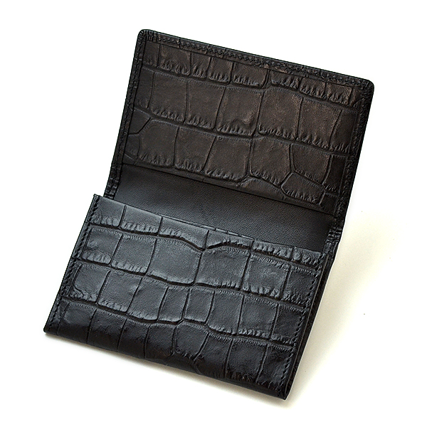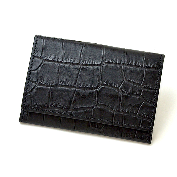 ヘビーレタンの革を使用。ヘビーレタンとは、革本来の質感を楽しめる植物性タンニンなめしと、耐熱性・柔軟性のある革になるクロムなめしの両方で仕上げられた革です。お使いいただくほどに艶が増し、味わい深くなるタンニンなめしの良さをあわせ持ちます。染料仕上げに色止め加工をし、革の高く盛り上がった部分にアイロンといわれる製法で熱を加え、ワントーン深い色合いに仕上げました。ROMEOクロコ型押し名刺入れ材質:牛革サイズ:W115×H75mm(ササマチ厚み15mm)名刺を入れてもあまり膨らみすぎず、スマートに収まるササマチを採用。横幅も少し大きめに仕上げ、マチ部分が名刺にあたらないようにしています。