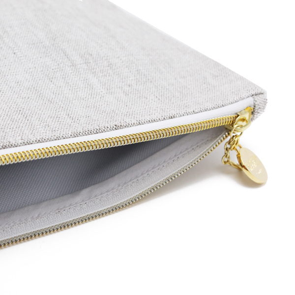 独自のラスターリネンと、メタリックカラーのポリブレンドフェイクレザーを使った大型ポーチです。