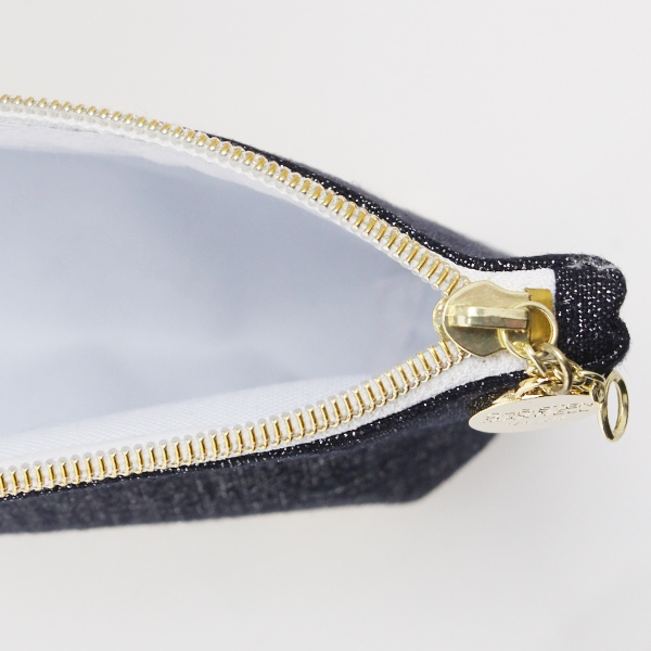 独自のラスターリネンと、メタリックカラーのポリブレンドフェイクレザーを使ったポーチです。
