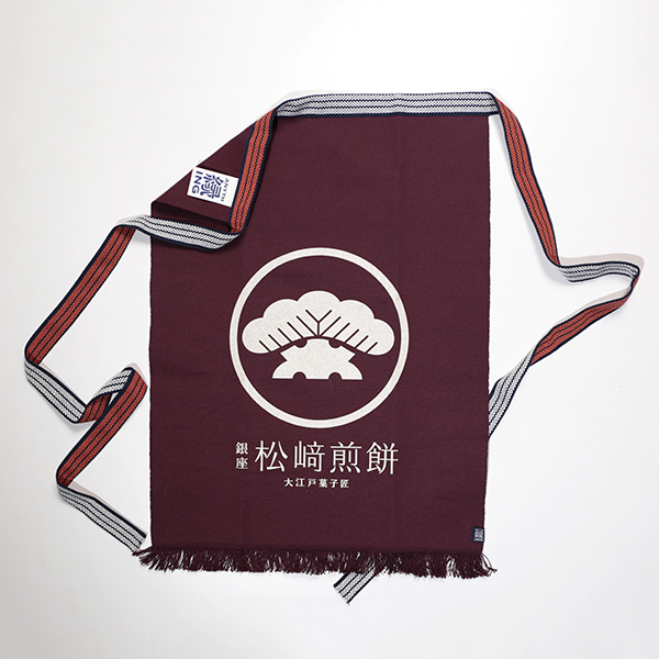 前掛けのデザインは、2007年、ブランドリニューアルをした際に作られた銀座 松崎煎餅のロゴです。