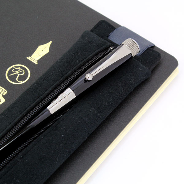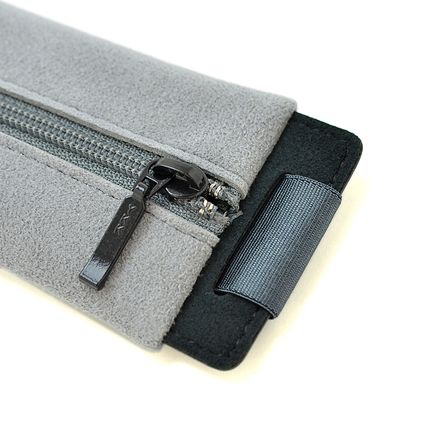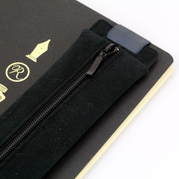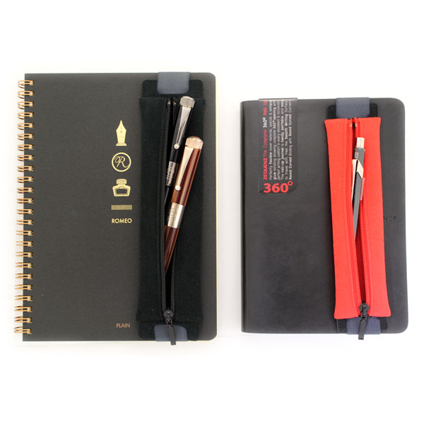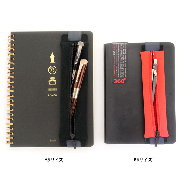A5サイズのノートに取り付けることが出来るバンド付きペンケース。ゴムバンドは薄くて適度な弾力のゴムを使用しているため、表紙の柔らかいノートにもご使用いただけます。センターチャックで収納力を高めました。収納できるペンの長さ:16cm前後