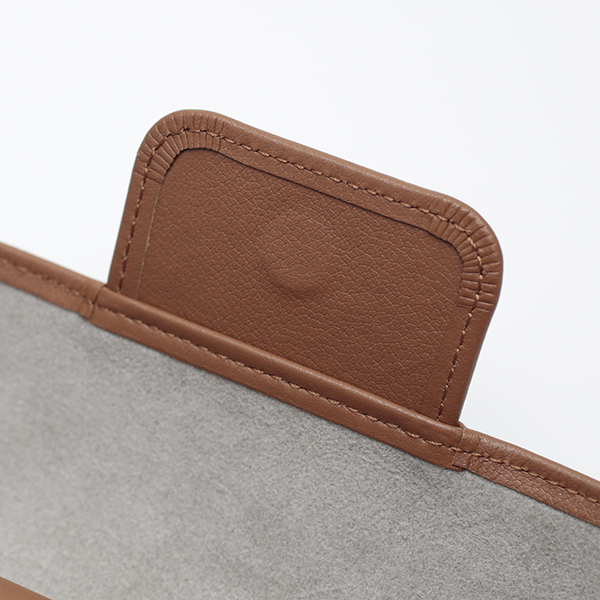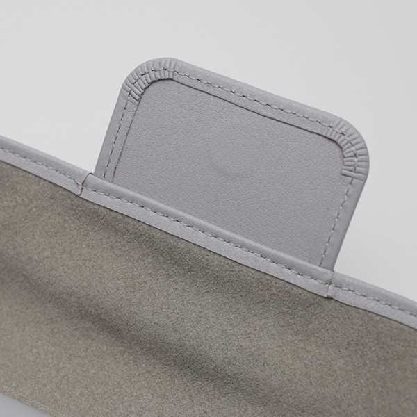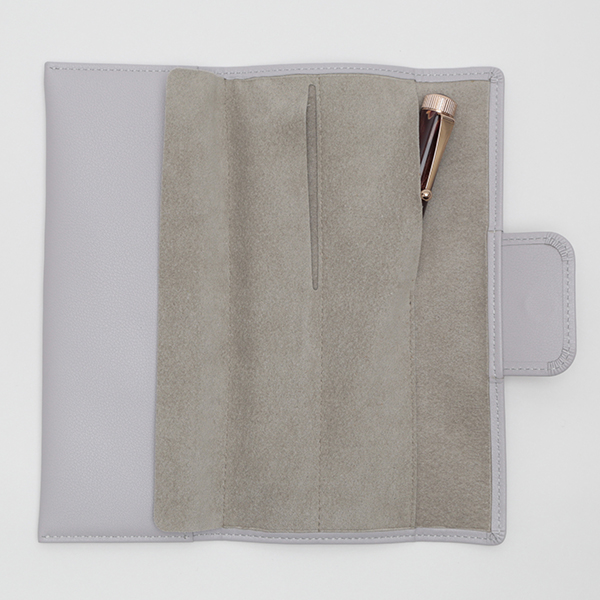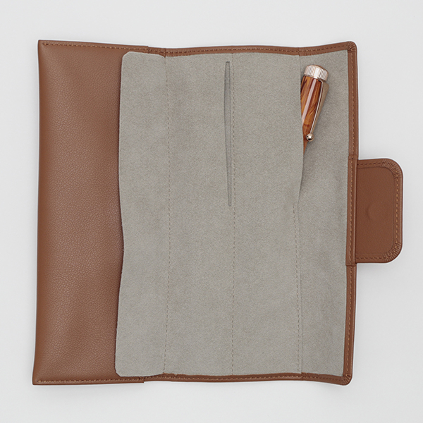ペンロールを留めるフラップ部分は、ジャケットのポケットの縫製を想起させるデザイン。
