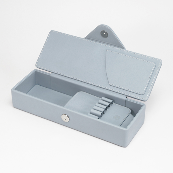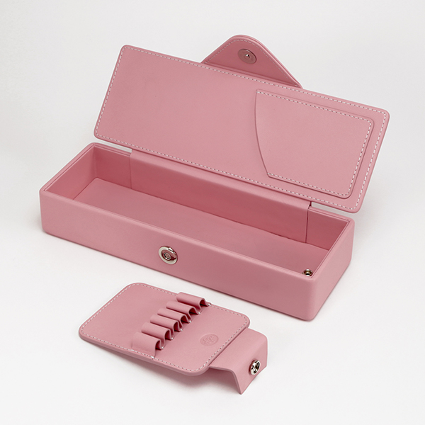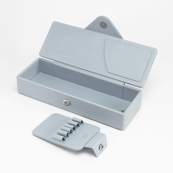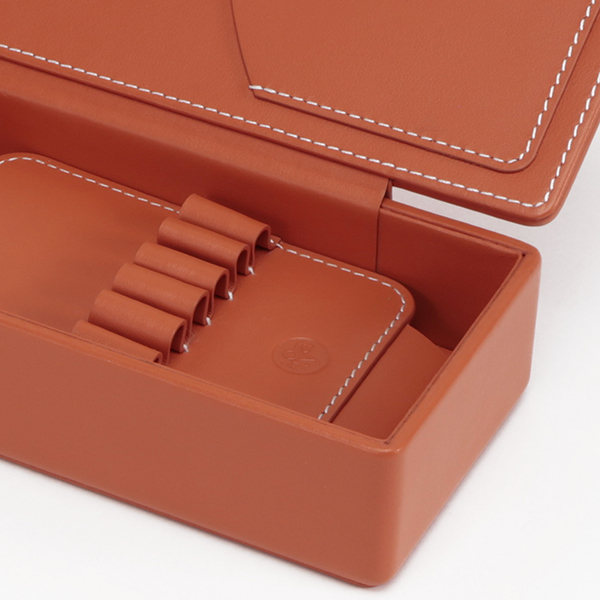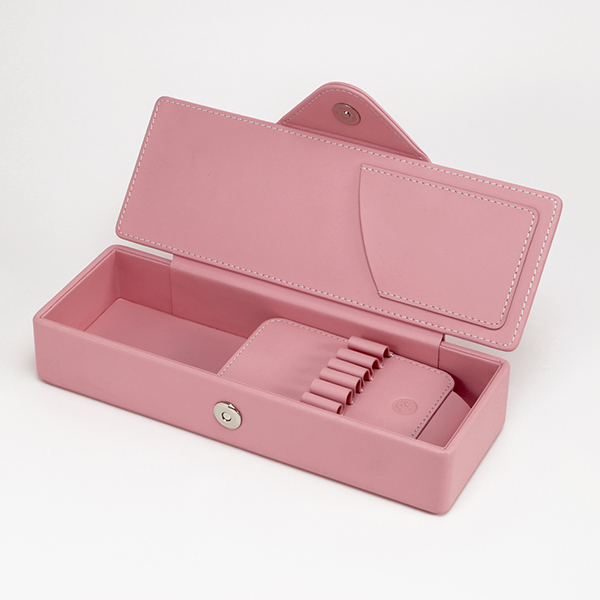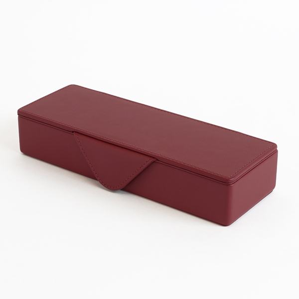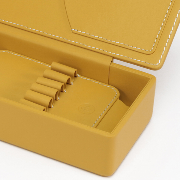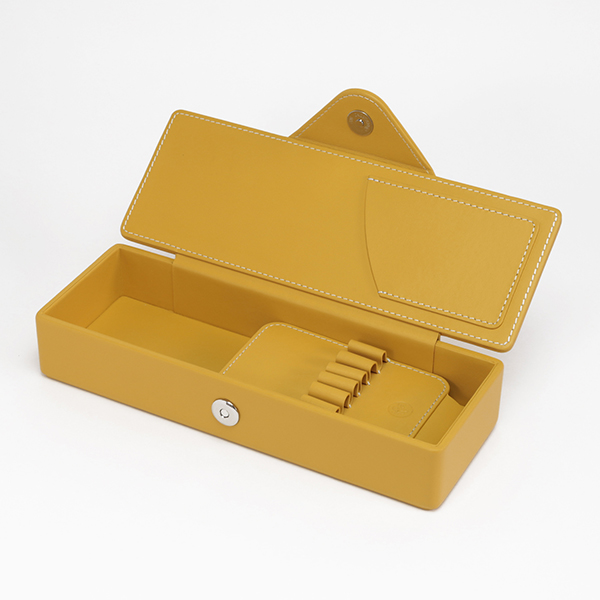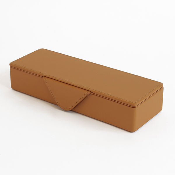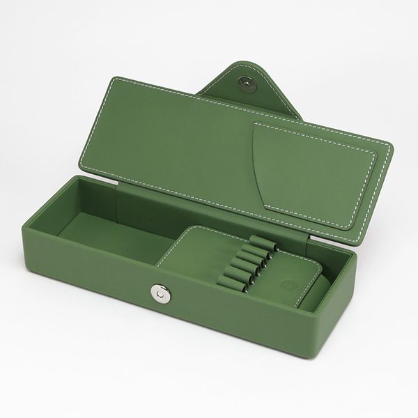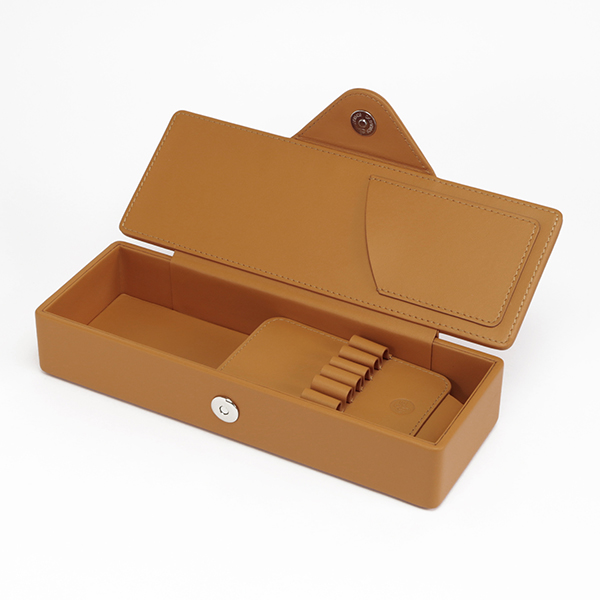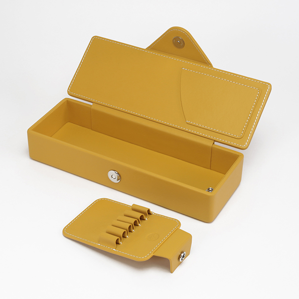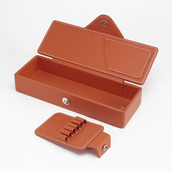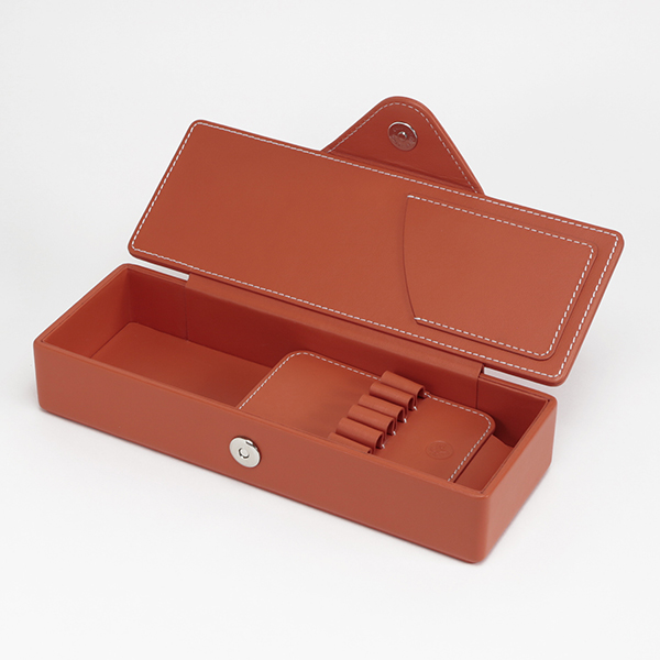 筆箱の角や天面を直線的に整え、すっきりした印象に。内側まで革張りを施した上質な道具箱のような佇まいになりました。