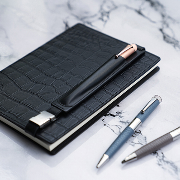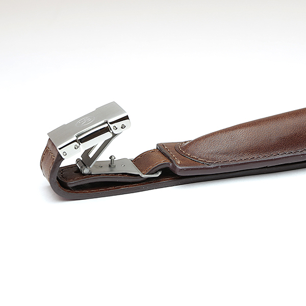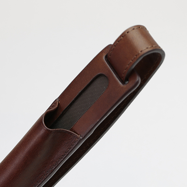 腕時計から着想を得たステンレスのバックルとアジャスト機能をもたせた革製ベルトが特徴のペンケース。控えめな光沢が美しいイタリア製レザーを用いた気品あるデザインと、常時筆記具をノートに装着しておける実用性を備えています。スマートな身のこなしやフットワークが求められるビジネスシーンで役に立つ、合理的なアイテムです。A5ノート専用。
