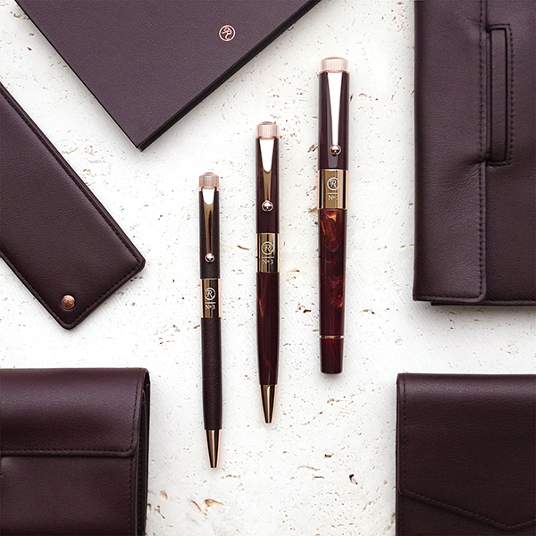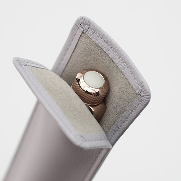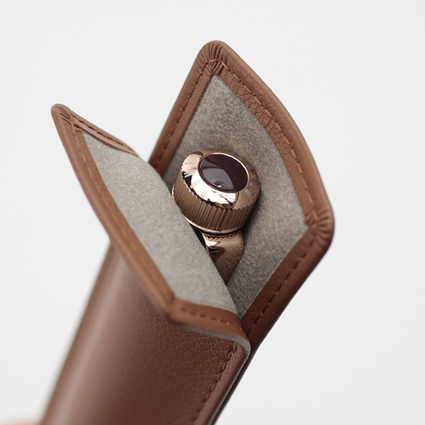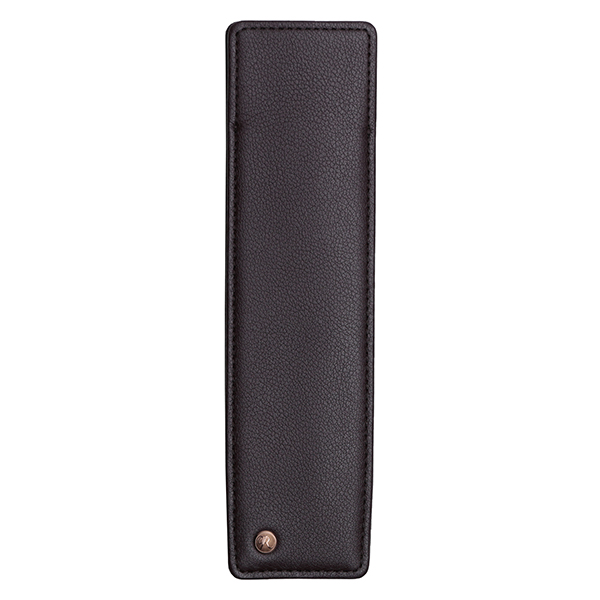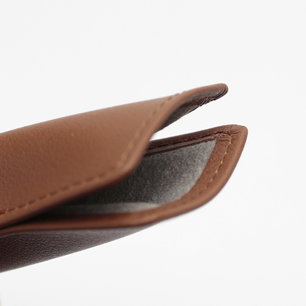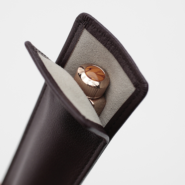 ステンレス製のロゴバッジがさりげない高級感を添え、発色の美しいイタリア製レザーは、使うほどにやわらかく手になじみます。内側にはウルトラスエード(R)を使用。大切なペンをやさしく守ります。