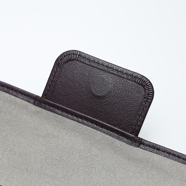 ペンロールを留めるフラップ部分は、ジャケットのポケットの縫製を想起させるデザイン。