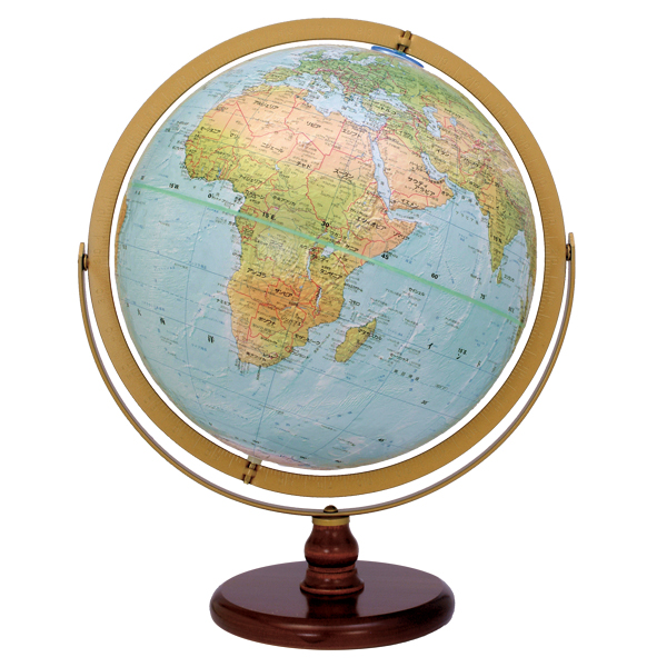 地球儀表面に山岳隆起及び海底陥没加工を施しています。 緯度目盛りがプレスされたスチール製の全円子午環は、南北にも転回するジャイロマティック構造ですから、世界中どこでも間近にご覧いただけます。丁寧にろくろ加工された木製の円形架台はお部屋の雰囲気を高める知的なインテリアとして人気の高いモデルです。