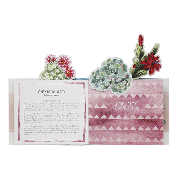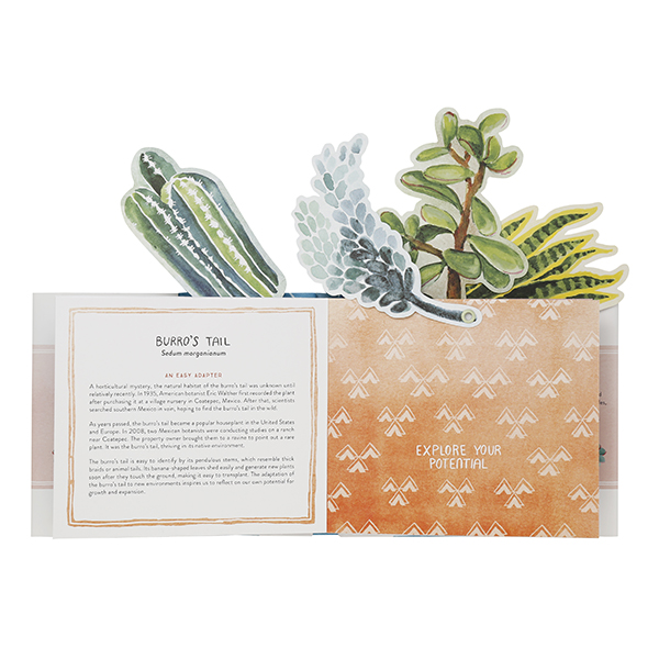様々なダイカットのサボテンが美しい挿絵の中に鳩目で各ページに留まっており、くるりと回転させると本から飛び出し、やさしい言葉が現れます。