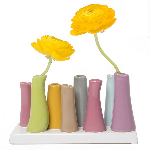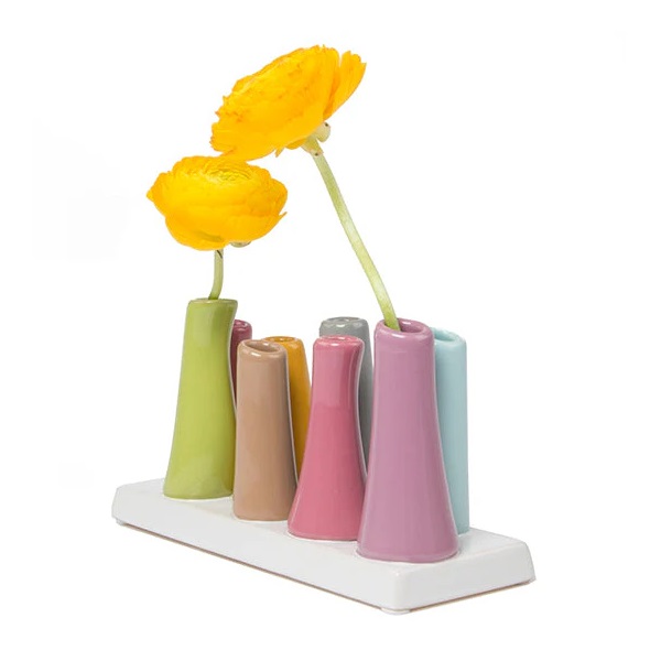 数本の花を添えるだけで華やかになる、一輪挿しチューブが8本生えたシンプルなデザインが人気です。