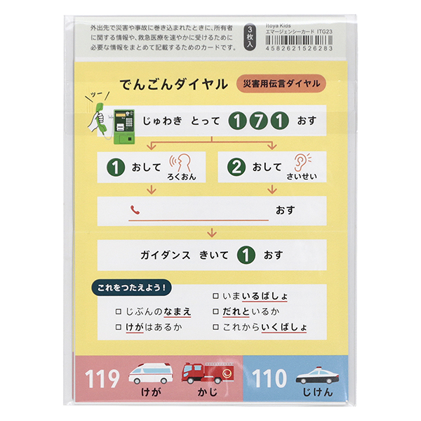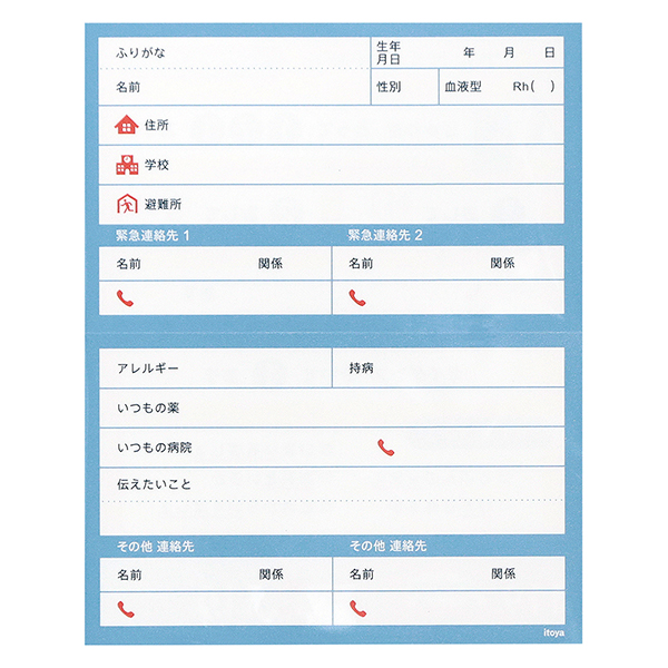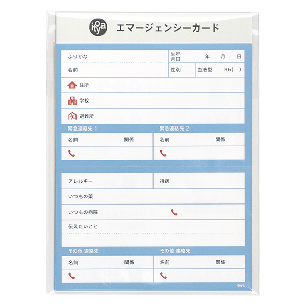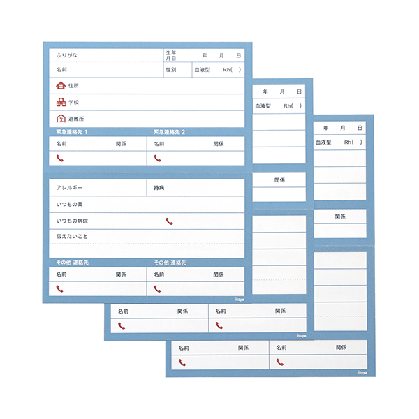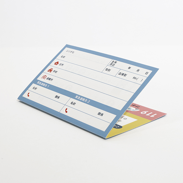 事故や災害、迷子などの緊急時に何をしたらいいのか思い出したり、周囲に助けを求めるときに必要な情報をまとめられるカードです。