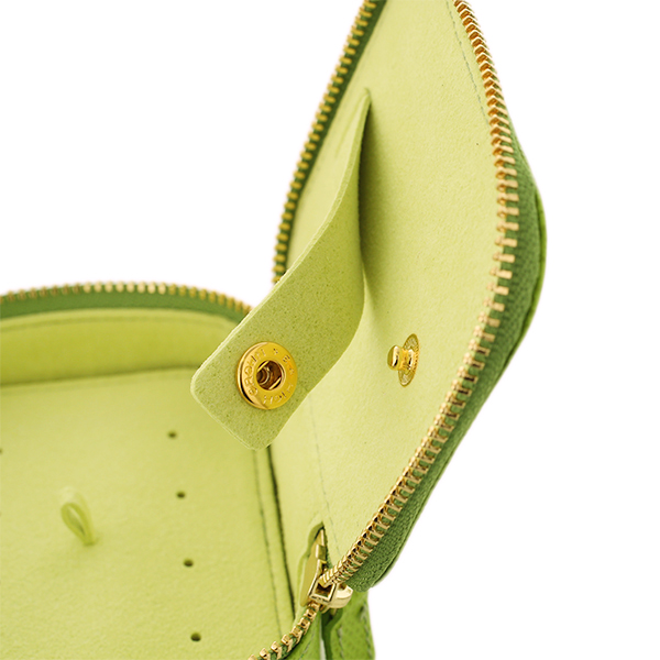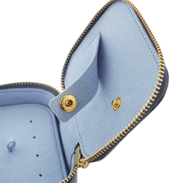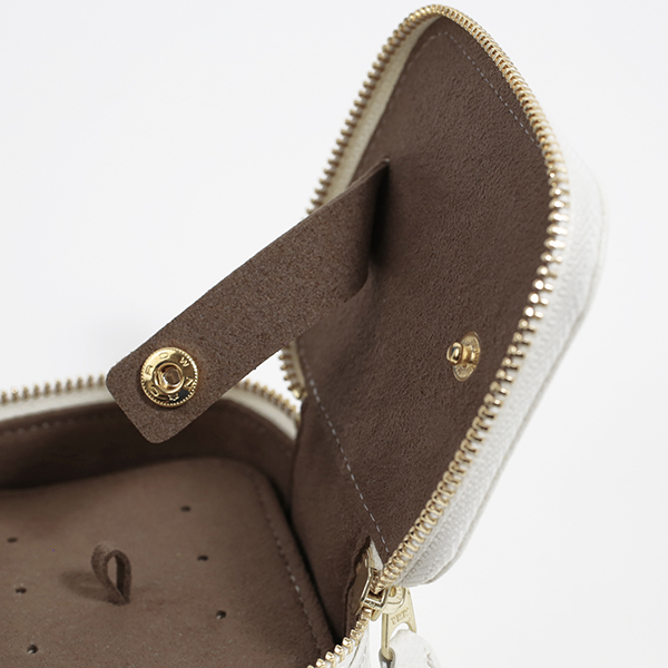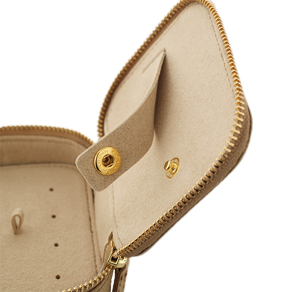 少し大ぶりなものを少量持つ、華奢なデザインのものを数セット持つ、など予定にあわせて使えて、安心して運べるように工夫を施しました。入れるものに合わせて効率よく収納できるよう、あえて仕切りは設けずシンプルに設計。アクセサリーを重ねて収納する時に必要なパーツをつけました。ピアスやピンズをホールドするピアスホルダー1枚の他、繊細なアクセサリーを傷から守る、柔らかなシートが2枚付属しています。このシートを上下に重ねたアクセサリーの間に挟めば、移動が多い場面でも安心して運べます。
