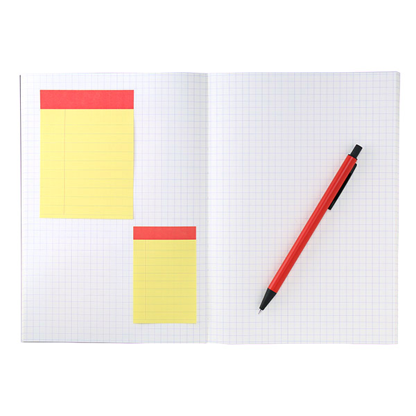 デスクやノートの上で、黄色と赤色が目を引きます。