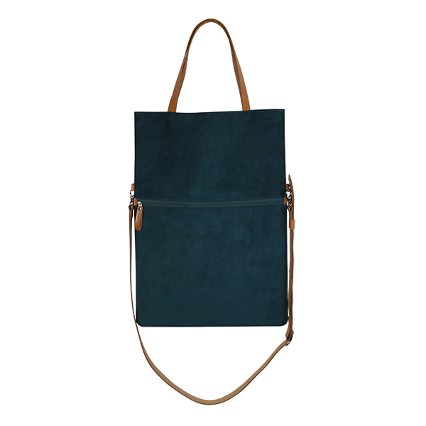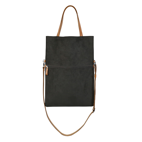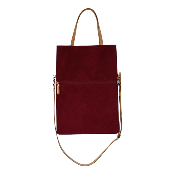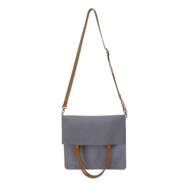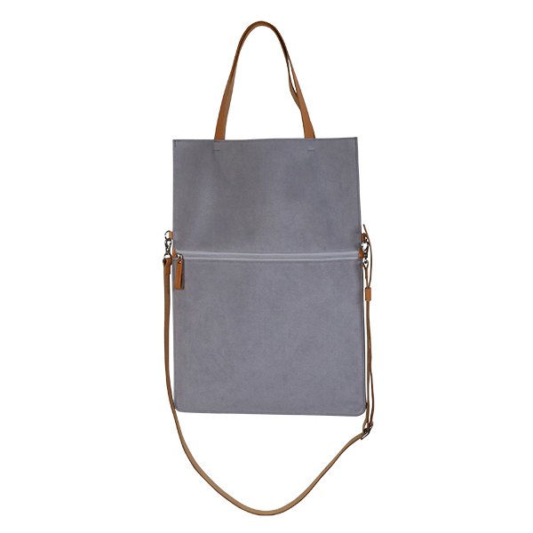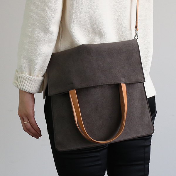 洋服にあわせやすい色合いの柔らかな生地にヌメ革をあわせた、軽やかなデザインのバッグは、シーンにあわせて使い分けできる2way仕様。