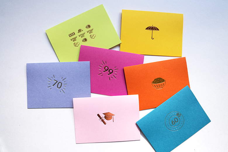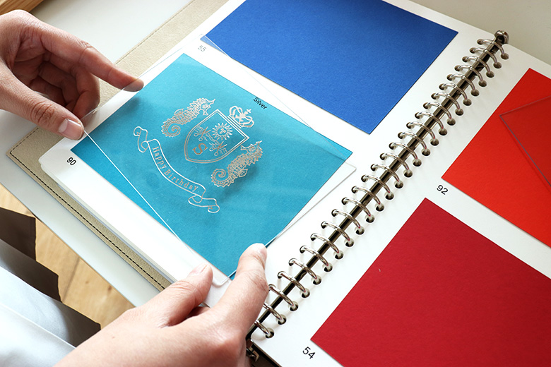 贈る人やシチュエーションを頭に浮かべながら カードと刻印の図案、箔のカラーを自由に組み合わせて、思う存分シミュレーションしてください。