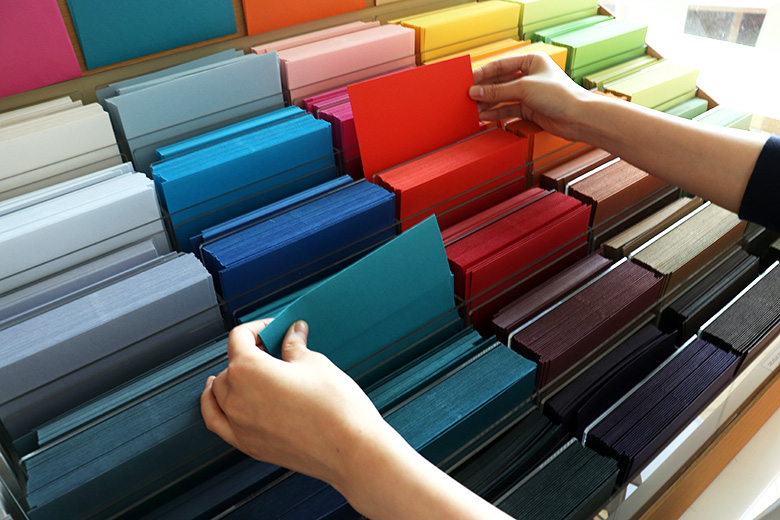 色の二つ折りカード。繊維から染めている紙の鮮やかな発色と、どの色を組み合わせても美しく映えるように計算された絶妙なカラーリングが特徴です。