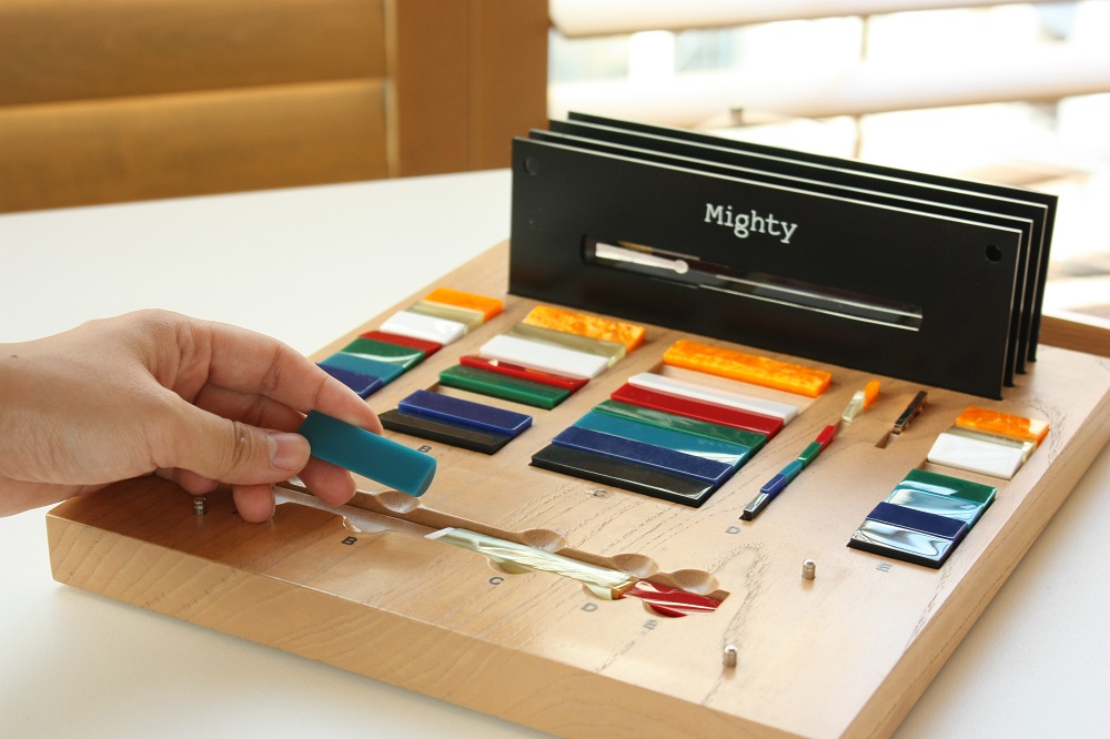 店頭のシミュレーターで、アクリルのバーを組み合わせながら選んでいきます。 - 2クリップの色を選ぶ。