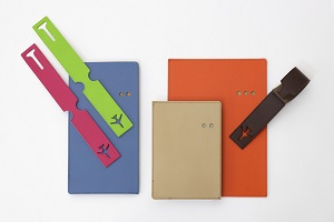 バッグ下のベージュ色のケース「リサイクルレザーケースA6」/写真中央下「バゲージタグ」