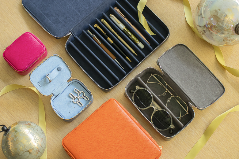 手前左「ジュエリーケース」、右「革製メガネケース」、左奥「コレクションペンケース」