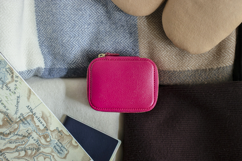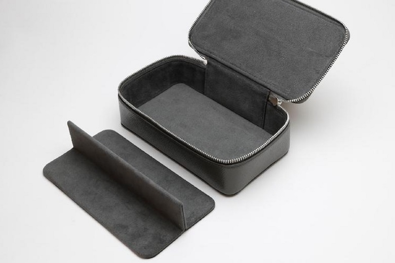 私がおすすめしたい「ジュエリーケース」は、美しい本革でつくられた箱型のケースです。手のひらに収まる、かわいらしいサイズ感。蓋を開けると、その裏にはリングを通すベルトがあり、他にもピアスホルダーやアクセサリー同士がぶつかるのを防ぐシートが2枚付属しています。