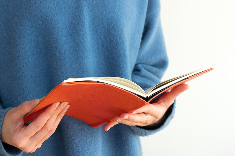 さらに、しなやかに仕立てているからノートにも手にもなじみやすく、開きやすく書きやすい。いうなれば、ハードカバーではなく”セミ”ハードカバー。ノートを開くときの抵抗感がほとんどなく、ノートの機能を最大限に発揮できます。