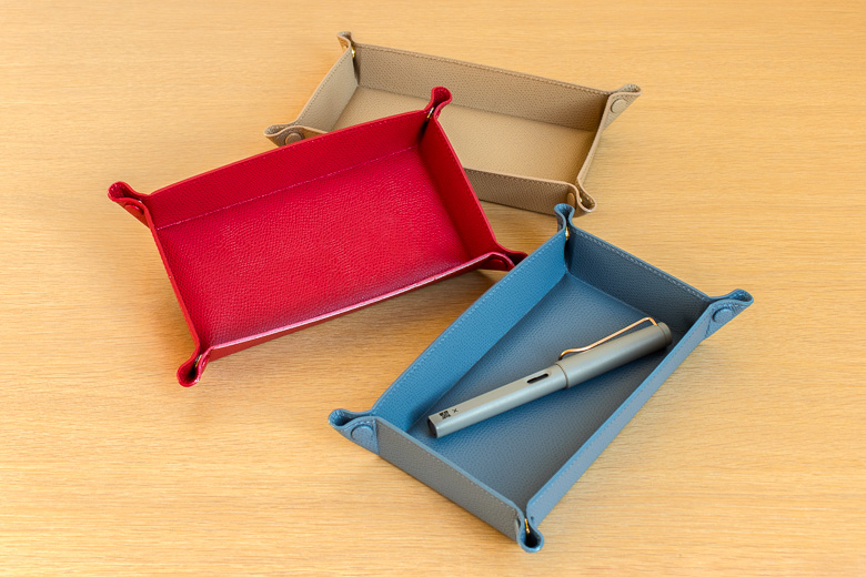 レザーでつくられているのもポイントです。高級感と品のよさを保つのはもちろんですが、収めたものに頻繁に手を伸ばすなら、トレーに戻す時の「音」も気になります。メタルや陶器のトレーも素敵ですが、「ガチャ」と硬質な音が気になったり、ふいに落として割れてしまわないかも不安なところです。レザーならば、音が響きにくく気になりません。入れるものをやわらかく受けとめてくれる使いやすさが毎日のお仕事にぴったりです。