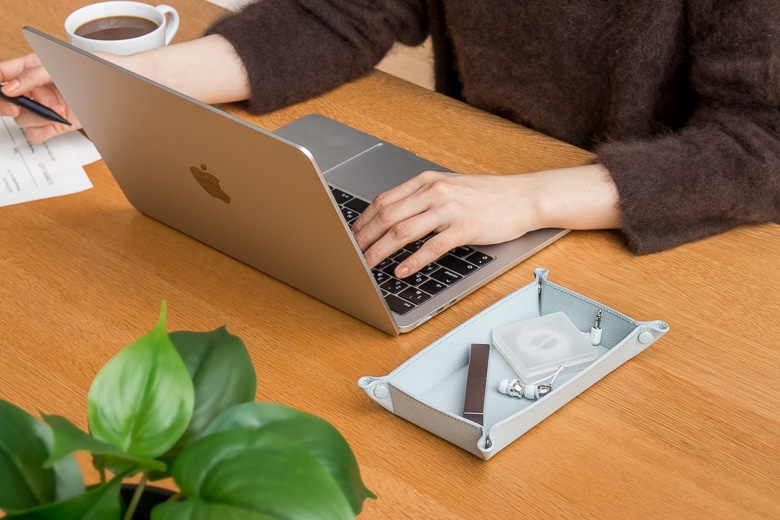 デスク環境をもう1歩快適にしたい、という方は革製トレーを取り入れてみるのはいかがでしょう。デスクワークを充実させるために気分を上げつつ、机の上は整頓された状態を保ちたい。心地よく考え事に没頭する環境をつくるアイテムとして活躍します。
