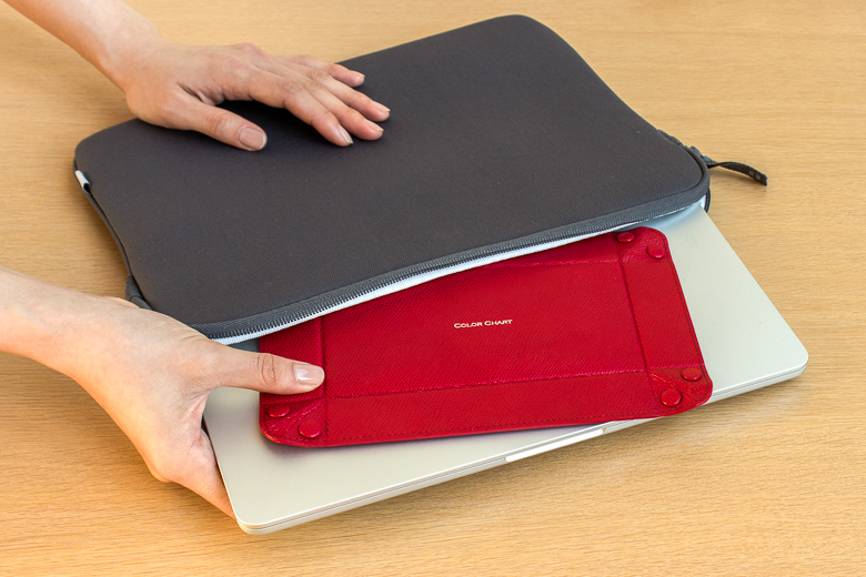実はこのトレー、四隅のスナップボタンを外すとフラットになります。PCケースにも入る薄さで、持ち運びもできるのです。今日はお家で、明日はオフィスでというように、働く環境が日によって変わっても負担なく運べます。