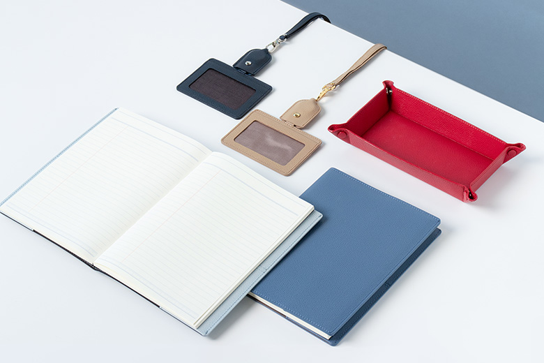 右上「ノートカバーA5」 左上「リール付きIDカードホルダー」 左下「革製トレー」
