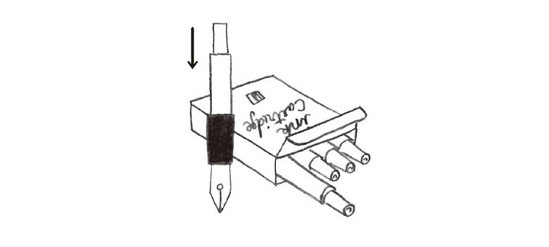ペン先に向けて、カートリッジインクを手ごたえがあるまでしっかりと垂直に差し込みます。