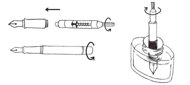 ペン先をインク瓶の中に入れ、尻軸を時計回りに回しながらインクを吸い上げます。