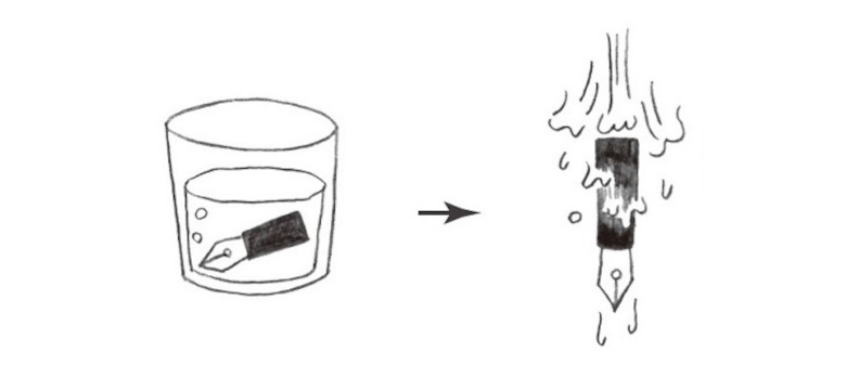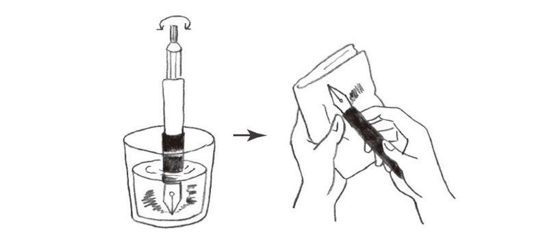 ペン先を胴軸から外し、水かぬるま湯に一晩つけてインクを落とします。流水ですすぎ、柔らかい布で水分をふきとります。