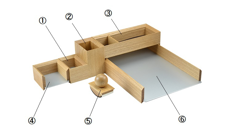 こうして完成した6つの机上用品。天然無垢材の木目が美しい佇まいは、愛用のデスク用品を整頓するだけに留まらず、デスクの上を上質な空間にするアイテムです。