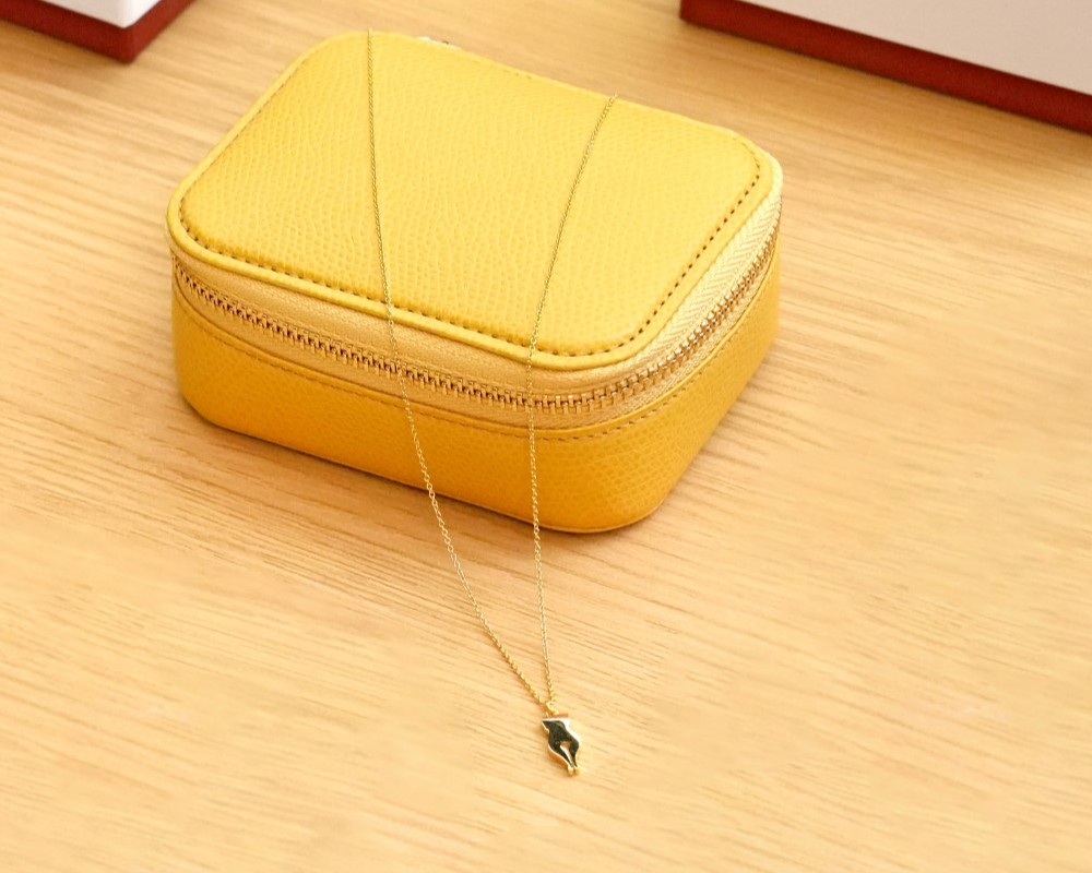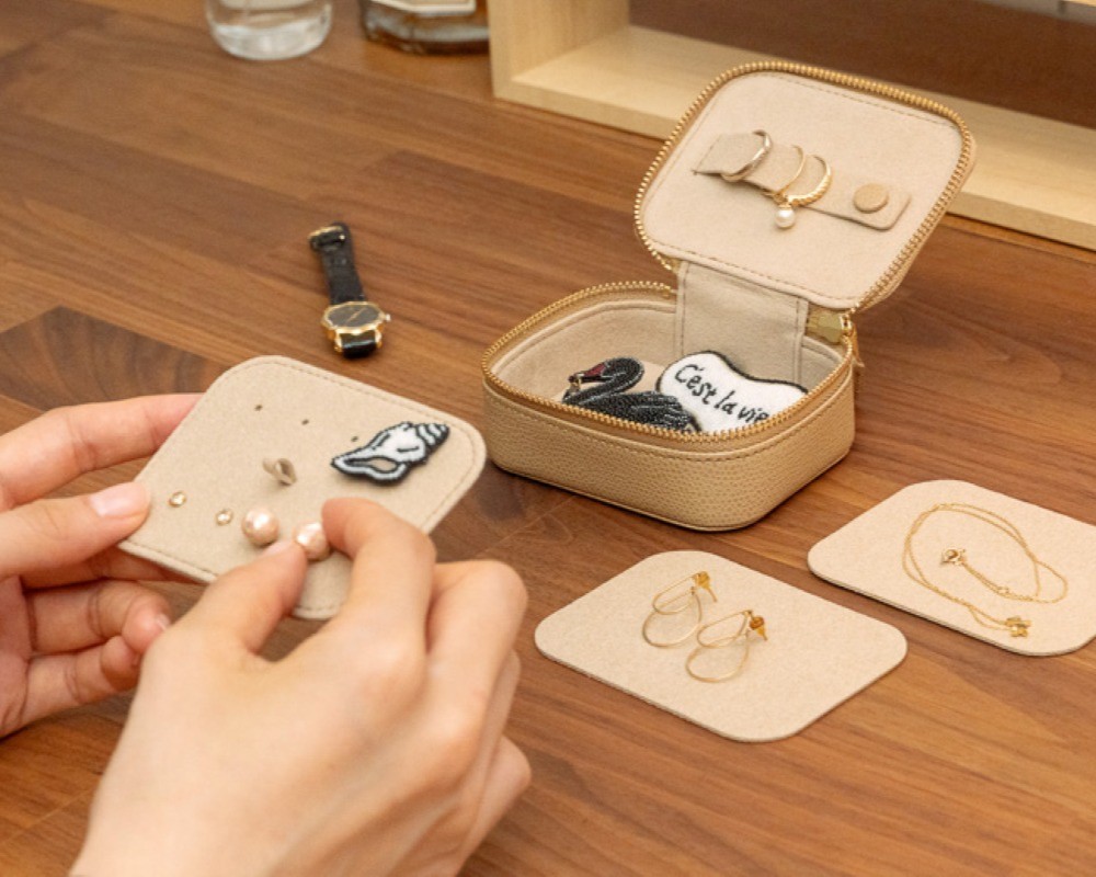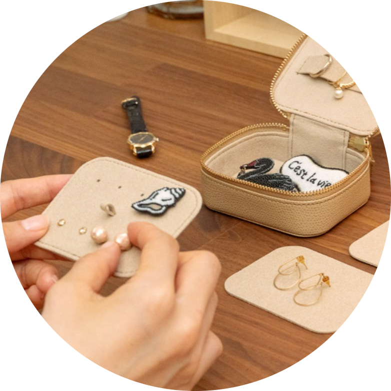 手のひらに収まるころんとかわいらしいフォルムと、品のある色が美しいレザーのジュエリーケースです。お気に入りのジュエリーたちをお出かけに連れていって、出先でも楽しむことができます。