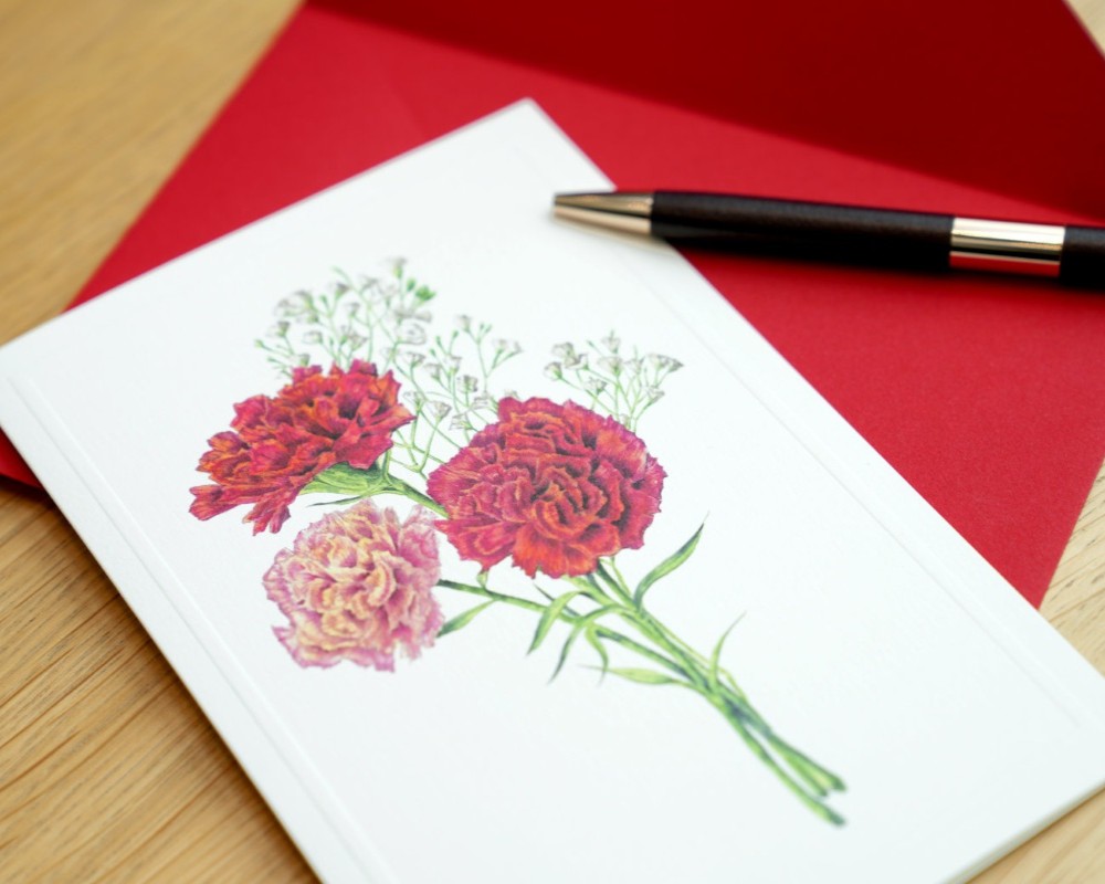 母の日にぴったりなカーネーションは、かわいらしいかすみ草とシンプルながら美しい花束に。周りには、さりげなくも品のあるエンボス加工をあしらいました。