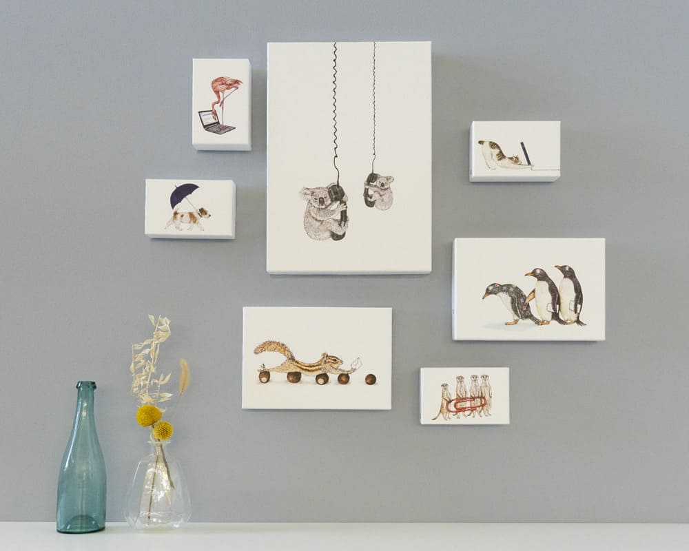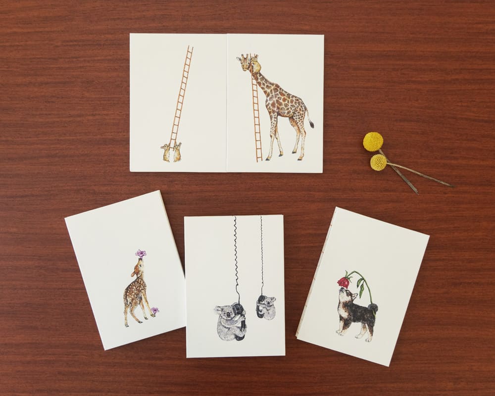 少しかすれのあるアナログ感が魅力のシルクスクリーン印刷を用い、秦直也の描く動物たちを細部まで忠実に再現しました。