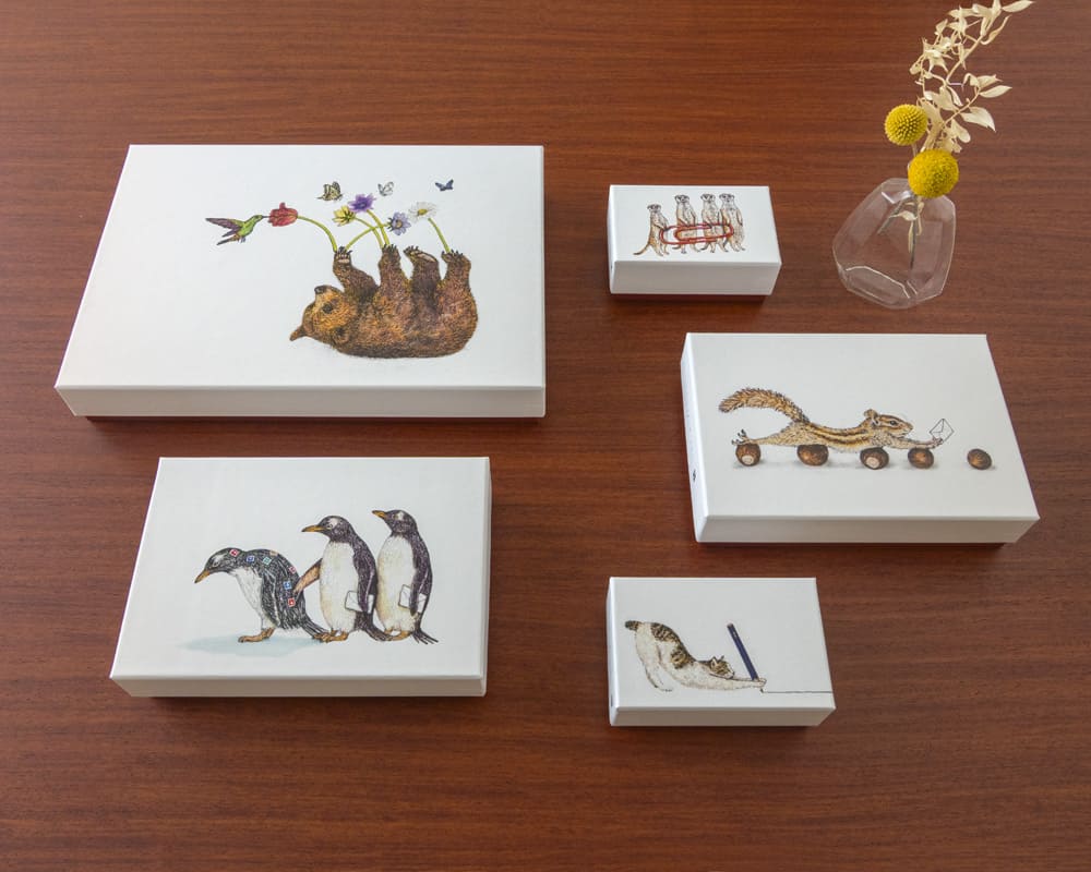 繊細なタッチで動物たちを描くイラストレーター・秦直也とのコラボレーションシリーズ。飾って楽しい、使ってうれしいアートボックスです。