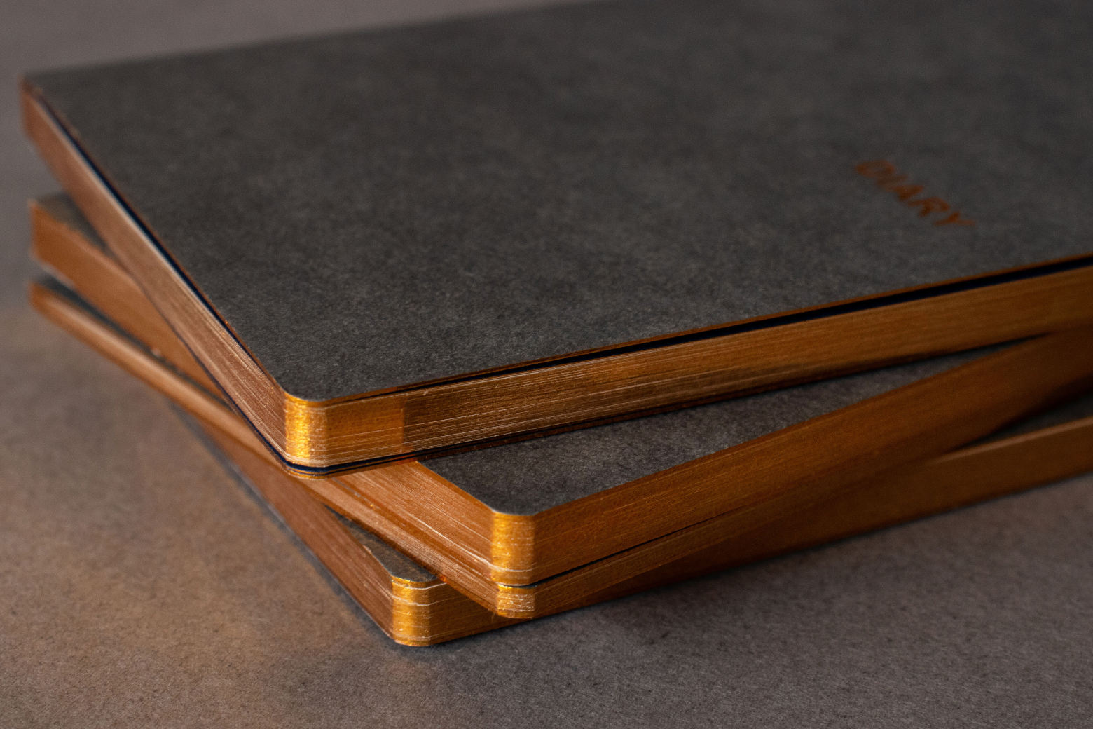 美しいグレーの表紙と、色鮮やかな見返しのカラーコントラストが印象的なデザイン。小口にはカッパー箔が上品に輝きます。各ページのコーナーにはミシン目付きで目的のページをすぐに探すことができます。
