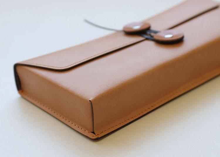 大人が日常的に楽しく素敵に大切な道具を持ち運べる「お道具箱」をイメージして、素材感豊かなリサイクルレザーのツールケースを作りました。マチ付きでふっくらとした立体感があり、ポケットサイズ文房具を入れるのにもちょうどいいサイズです。