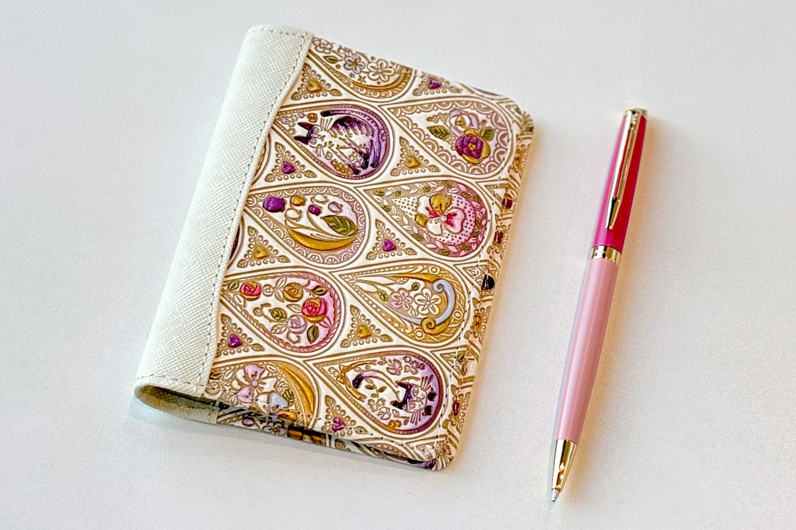 ペンは、〈ウォーターマン メトロポリタン エッセンシャル ピンクGT〉をセレクト。かわいいにかわいいを合わせました。濃淡の違うピンクのバイカラーになっていて、さまざまなカラーが入っているこのシステム手帳にぴったりです。