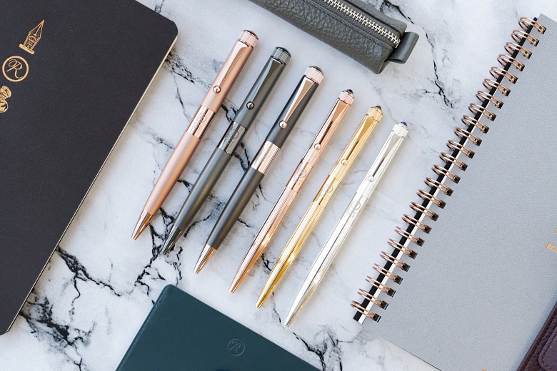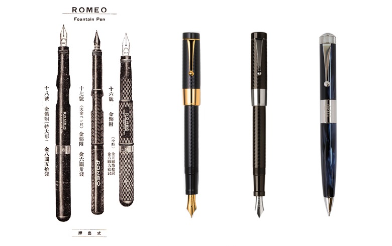 左から:初代ロメオ万年筆(カタログ挿絵)、ROMEO No.2(金:100周年記念限定モデル、銀:第2弾・数量限定)、ROMEO No.3