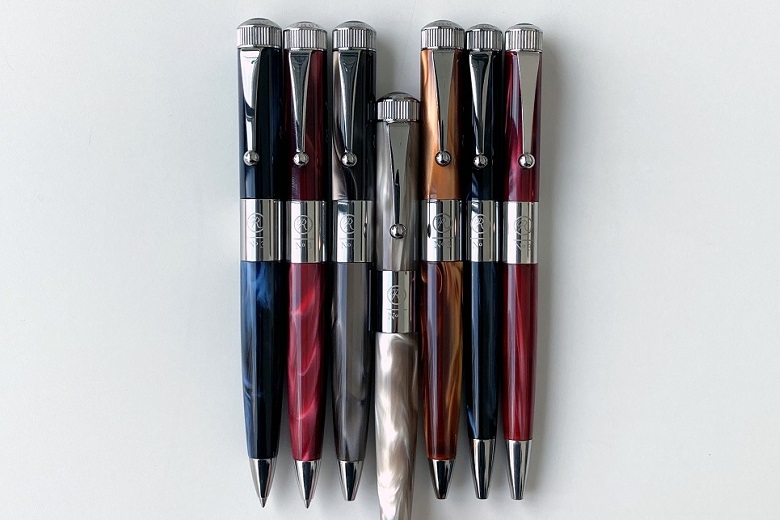 芯を繰り出す天冠は、時計の時刻を合わせる「竜頭」がモチーフ。「大切な時間をこの筆記具と共に過ごしてほしい」という想いを込めました。 ノック音がしない静かな書き出しもスマートです。